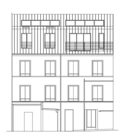 La surélévation de cet immeuble traditionnel s’intègre dans le rythme de la rue, parmi les variations de hauteur des immeubles voisins.